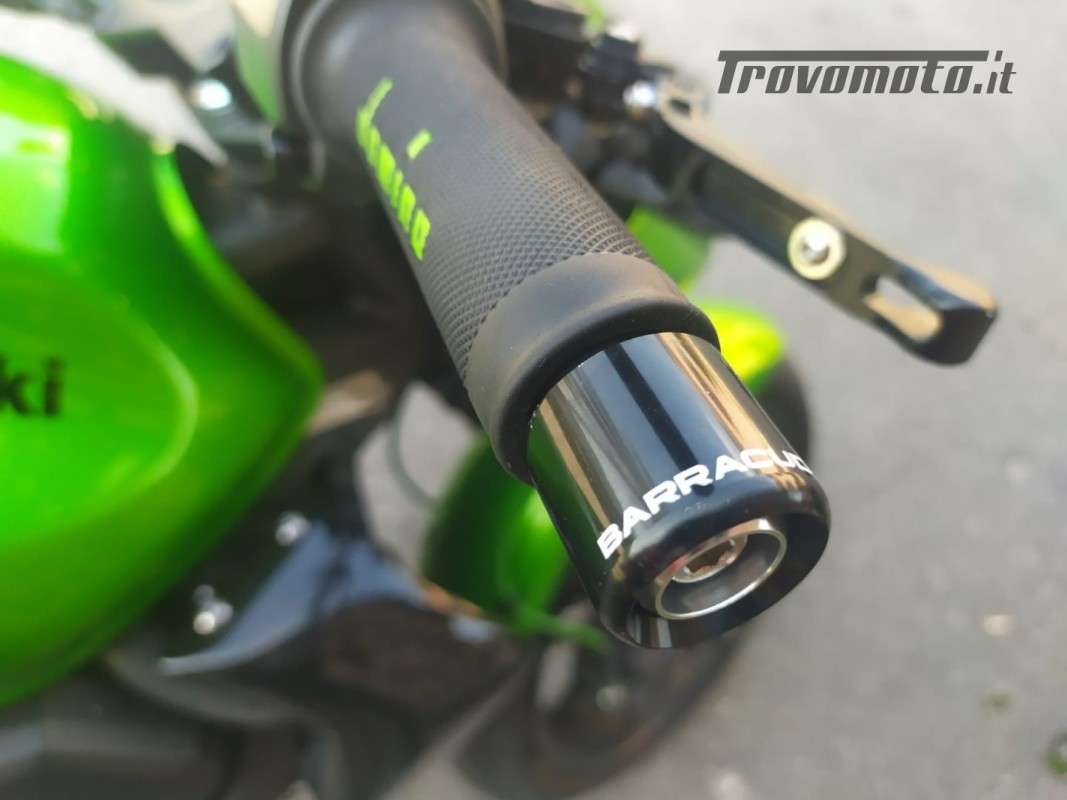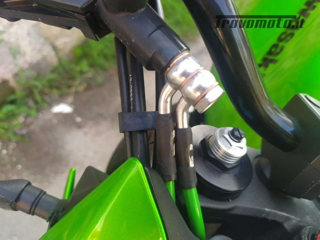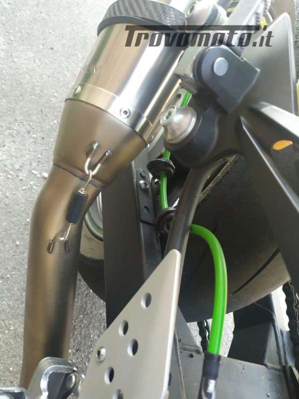 Equipaggiata con scarico Leovince SBK, porta targa sportivo, leve freno e frizione dedicate, bilancieri BARRACUDA, specchietti in alluminio anodizzati neri e Tubi in treccia verdi, con sistema tubo singolo per pinza del freno.