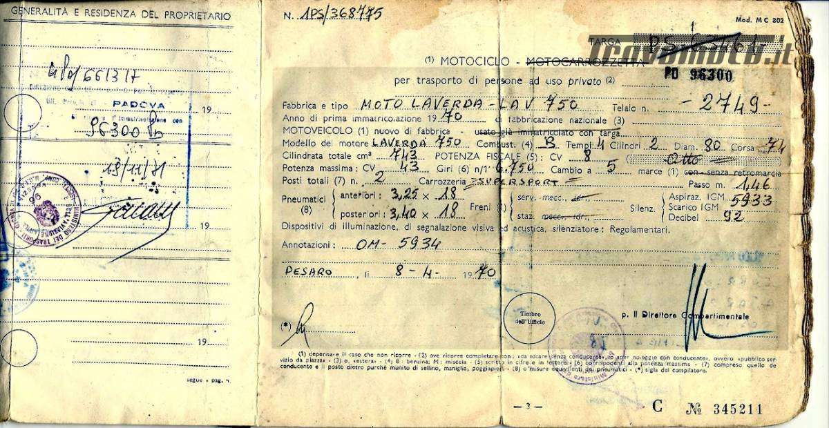 VENDO PER GRAVI MOTIVI DI SALUTE LA MIA SPLENDIDA LAVERDA 750 GT, TELAIO 2749, TARGA PD 96300, IMMATRICOLAZIONE DEL 8/4/1970. 743 CC, CV 43, 5 MARCE. RESTAURATA COMPLETAMENTE DA RICCARDO ORO STORICO CONCESSIONARIO LAVERDA DI BREGANZE.