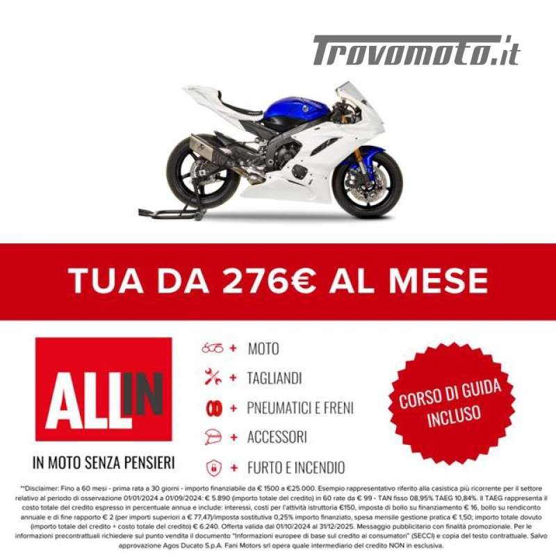 La moto è disponibile già in pronta consegna. Il prezzo è totalmente finanziabile. Siamo concessionari ufficiali di Yamaha, KTM, Triumph, Kawasaki, Moto Guzzi, Aprilia, MV Agusta, Fantic Motor, Benelli, Keeway, Mash. Consegnamo in tutta Italia isole comprese. Se hai una moto in permuta inviaci le foto e la descrizione della tua moto usata, ti invieremo il nostro miglior preventivo. Siamo a Firenze dal 1975 al servizio della passione a 2 ruote.;